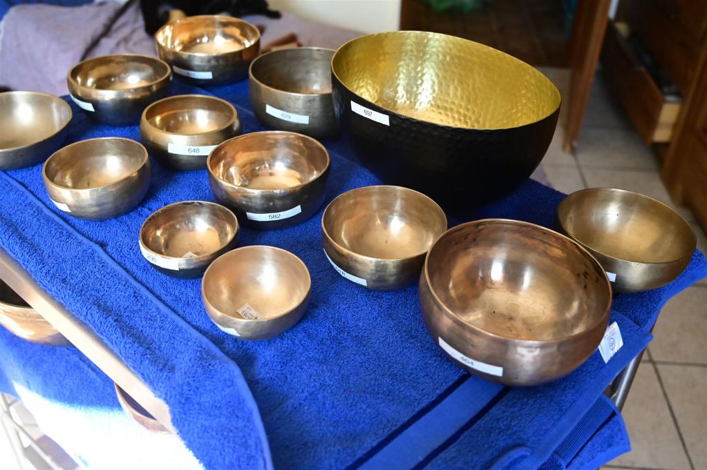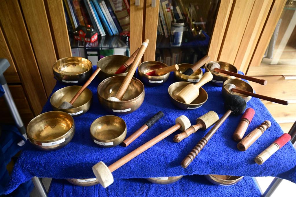 Während der Sitzung kommen unterschiedliche Klangschalen und Instrumente zum Einsatz. Ihre verschiedenen Klänge und Schwingungen entfalten sich in ruhigen Abfolgen und unterstützen den meditativen Prozess.